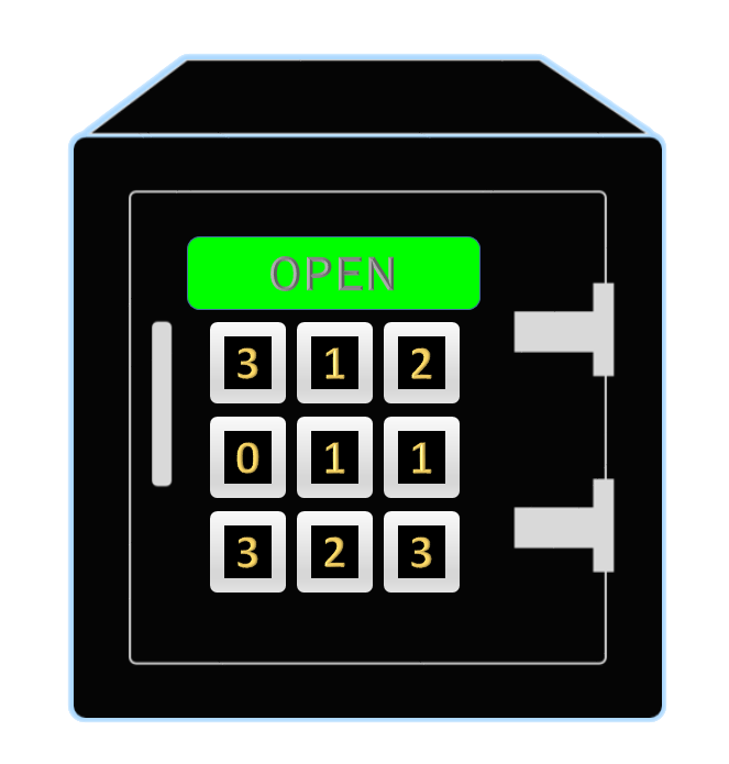 This particular safe has 9 buttons with digital displays. Each button shows a single digit in the range 0..3. When you push one of the buttons, the number it displays is incremented by 1, circling around from 3 to 0. However, pushing a button will also increment the other digits in the same row and the same column as the button pushed.