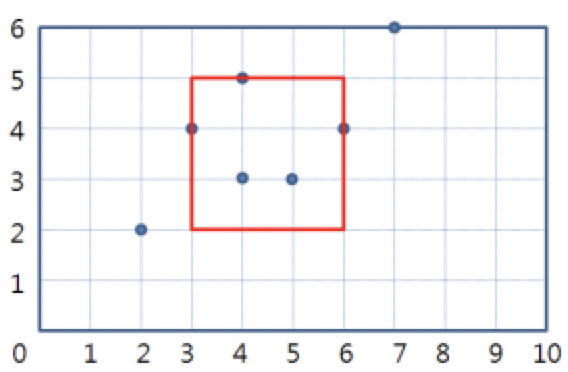 첫째 줄에 4개의 정수 N, M, T, K가 빈칸을 사이에 두고 주어진다. N은 지도의 너비를 나타내고, M은 지도의 높이를 나타낸다(1 ≤ N, M ≤ 1,000,000). T는 금강석의 개수를 나타내고, K는 정사각형의 크기(한 변의 길이)를 나타낸다. T는 1 이상 100 이하이고, K는 1 이상 1,000,000 이하로서 N과 M보다 크지 않다. 둘째 줄부터 T개의 줄에는 각 줄마다 각 금강석의 위치 (A, B)를 나타내는 두 개의 정수 A와 B가 빈칸을 사이에 두고 주어진다. A는 0 이상 N 이하이고, B는 0 이상 M 이하이다. 입력으로 주어진 금강석의 좌표들은 모두 다르다.