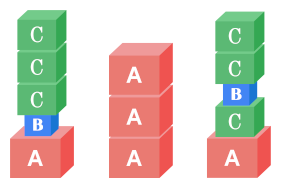 The leftmost two megatowers are valid, since each letter appears in a contiguous group. However, the rightmost megatower is not valid, because there is a B in between two Cs.