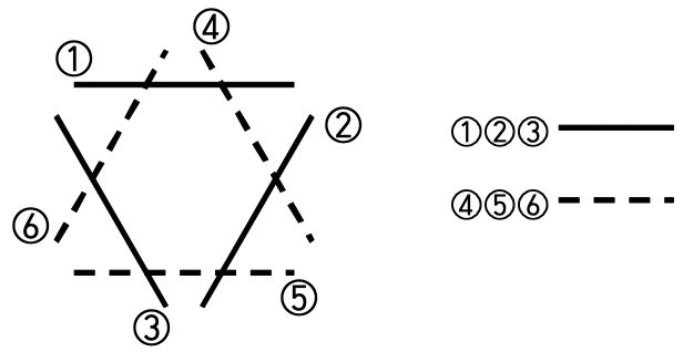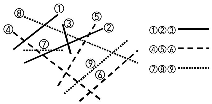 예를 들어, 학생 세 명이 각자 가지고 있는 막대기 ①②③, ④⑤⑥, ⑦⑧⑨를 바닥에 던진 막대기 모양이 아래와 같을 때, 막대기 한 개씩 ②, ④, ⑧을 제거하면 나머지 여섯 개의 막대기는 서로 겹치지 않게 된다.