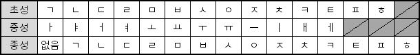 현대 한글의 모든 초성, 중성, 종성 목록은 다음과 같다.