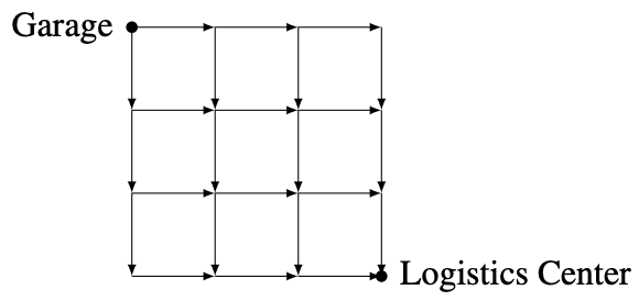 To grow her business, Ellie wants to start offering parcel pickup too. However, the mayor of Grid City recently decided that all streets will be one-way streets during the day to combat traffic jams. During this time, the streets of Grid City can only be passed from north to south or west to east, respectively.