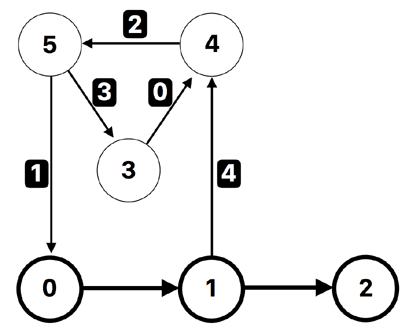 add_teleporter(3, 4): You should return $0$.add_teleporter(5, 0): You should return $0$.add_teleporter(4, 5): You should return $0$.add_teleporter(5, 3): You should return $0$.add_teleporter(1, 4): At this point it is possible to get infinite number of stamps. For example, the tourist starts in the planet $0$, goes to the planets $1, 4, 5, 0, 1, 4, 5, 0, \ldots$ in this order. Hence, you should return $1$, and your program will be terminated.The following figure illustrates this example. The special planets and the starting teleporters are shown in bold. Teleporters added by add_teleporter are labeled from $0$ through $4$, in order.