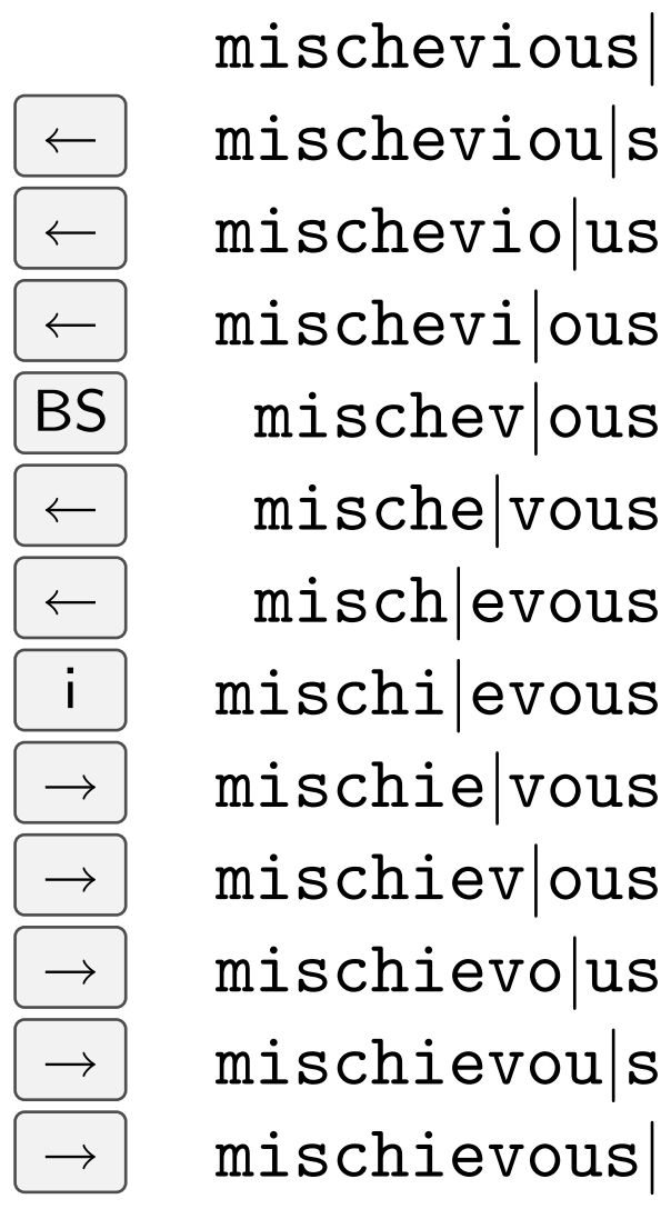 On her spare time Caitlin loves to do speed typing. Unfortunately Caitlyn was never good at spelling. So what often happens is that Catelin makes a mistake spelling a word, and has to go back and fix her typo. One word in particular that Caitlynn has a hard time spelling is the word mischievous. Catelyn usually spells it mischevious instead. In order to fix this typo, Caytlin needs to do 12 key presses.