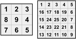 왼쪽 그림은 크기 $N$이 $3$, 오른쪽은 $5$인 경우 이차원 달팽이 배열이다.