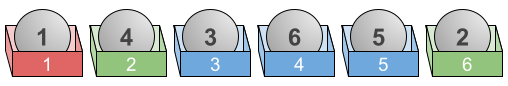 For example, suppose the balls appear in the order $1, 4, 3, 6, 5, 2$ (as seen above). He might choose — not necessarily optimally — to give the first box the color red, the second and sixth boxes the color green, and the third through fifth boxes the color blue. Then, after Goro bumps the table,