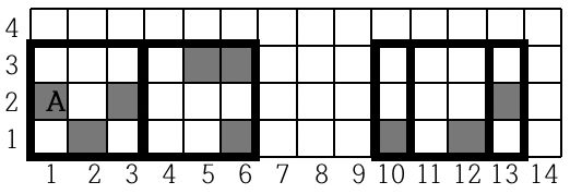도화지 위의 행은 다음 그림과 같이 맨 아래에서 위쪽으로 1번부터 순서대로 번호가 매겨져 있고, 열은 왼쪽에서 오른쪽으로 1번부터 번호가 매겨져 있다. 이 그림은 도화지에 가로선과 세로선을 그어서 4개의 행과 14개의 열, 그리고 56개의 칸으로 나눈 모양을 보여준다. 잘못 칠해진 칸은 회색으로 표시되어 있다.