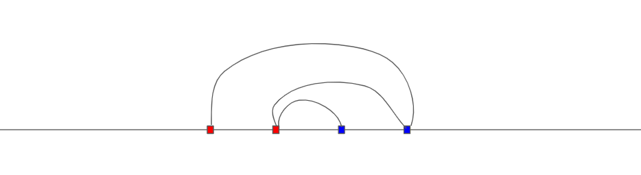 예를 들어, 아래와 같이 4개의 점이 있고 1, 2번 점은 붉은색, 3, 4번 점은 푸른색인 경우 1번 점과 4번 점, 2번 점과 3번 점, 2번 점과 4번 점 사이에 선을 연결하여 총 3개를 그을 수 있다.