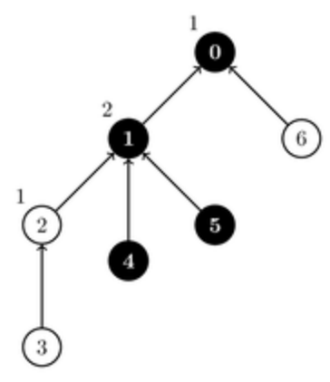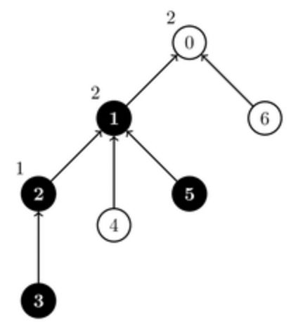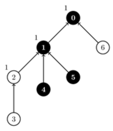 이 회로에서 게이트 $3$과 $5$의 상태는 $1$이고 게이트 $4$와 $6$의 상태는 $0$이라고 하자. 게이트 $2$, $1$, $0$의 파라미터는 각각 $1$, $2$, $2$라고 하자. 이 경우, 게이트 $2$의 상태는 $1$, 게이트 $1$의 상태는 $1$, 게이트 $0$의 상태는 $0$이 된다. 위의 상황은 아래 그림에 표시되어 있다. 게이트의 상태가 $1$인 것들이 검은 색으로 표시되어 있다.