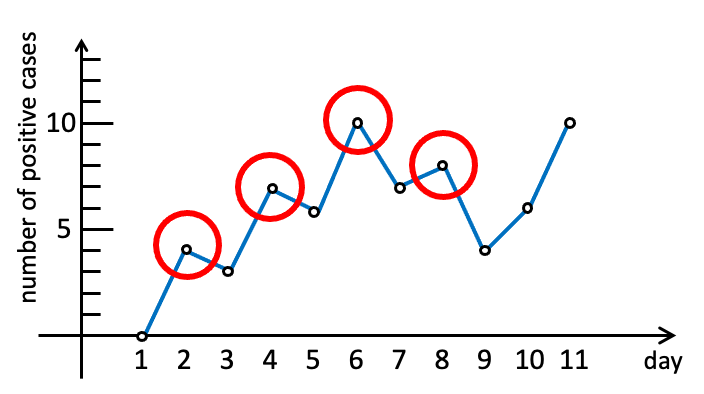 As the PCR tests started before the disease started spreading in the city, the number of positive cases is zero on the first day. The last reported day is not counted as a peak. No two consecutive days have the same number of positive cases.