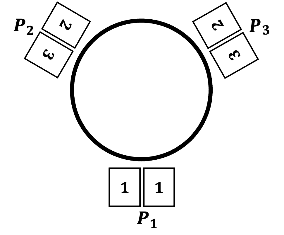 First, any player who has a pair of cards with the same number discards them. If by chance all the players discard the cards in hand, the game ends. Otherwise, the following actions are repeated until the game ends. Note that, from now on, for a player p, the next player means the player closest to p in the clockwise direction among those who still have one or more cards at that point in time.