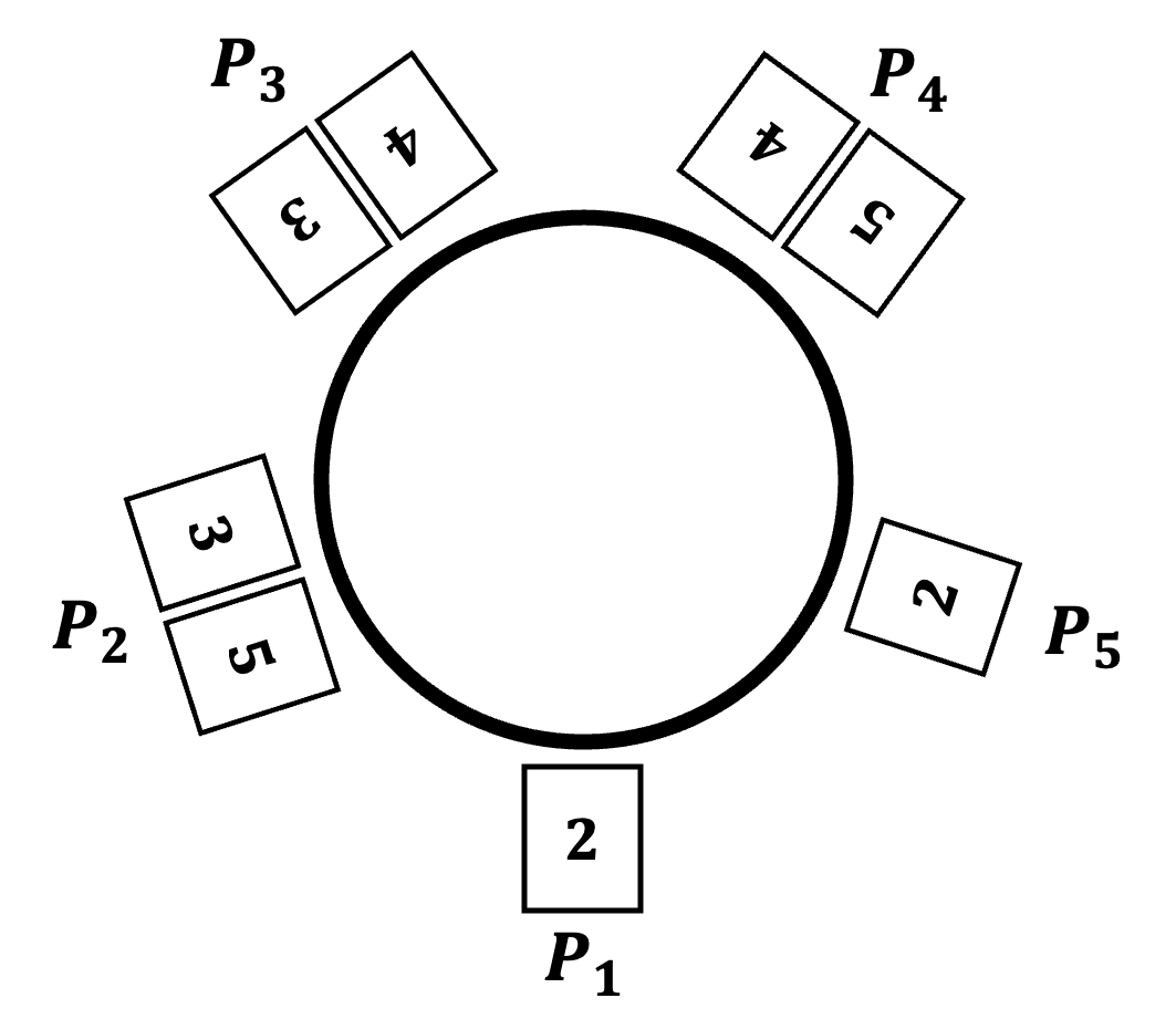 After this, P1 draws the only remaining card in P5's hand and discards the drawn card and the card with the same number 2 in the hand. The player to be drawn from the hand next is the next player of P5, which is P2 because P1's hand is empty now.