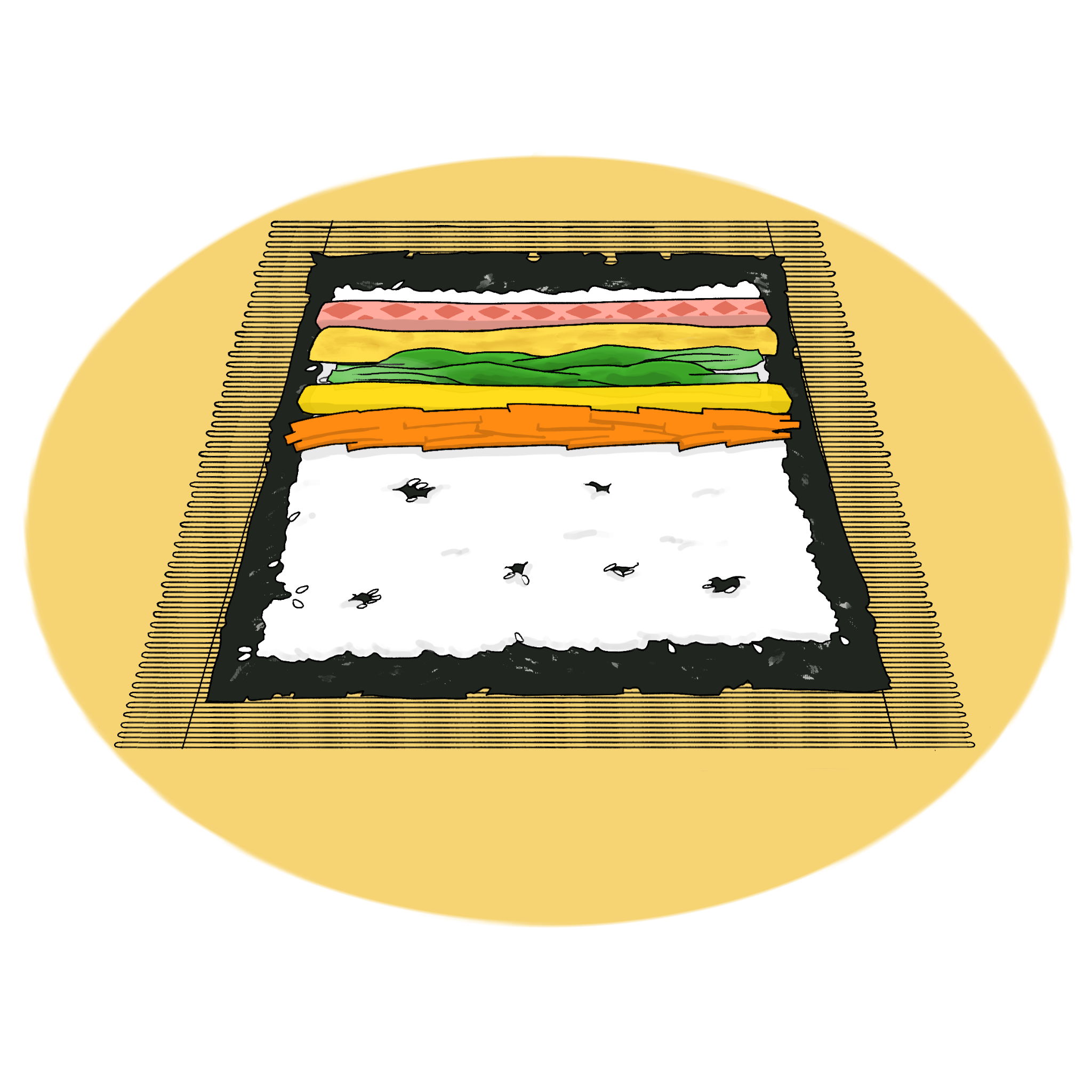 [그림 1] 김밥을 말기 위해 김 위에 식재료를 얹은 모습