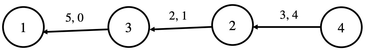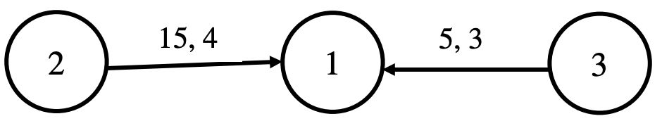 What complicates the decision process (which roads to build) is that if a road originates from a village, the Leader of the village wants some Royalty; the Leader won’t allow the road construction otherwise. The Royalty is not, unfortunately, a fixed amount; it is based on a future forecast. More specifically, it is a factor of how much DF will have in his pocket at the end. For example, the solutions (needed roads) for the first two Sample Input are shown on the last page (Node 1 is the Voting Station and the remaining nodes represent the remaining villages). For the first example: