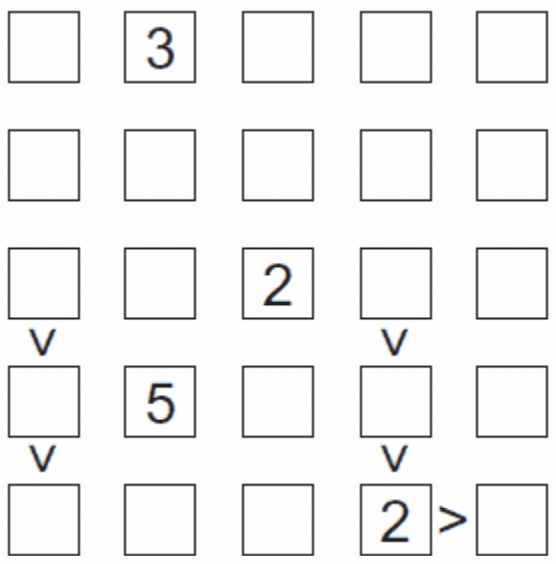 You thought it would never happen, the Sudoku craze is finally over! People are overwhelmingly bored of Sudoku puzzles. To take advantage of their fatigue, you’ve decided to make up a new puzzle, called “More or Less1”, so that you can become rich! Naturally, so that the old Sudoku solvers won’t be lost, your rules must be of a similar format to Sudoku, but nonetheless be different. You’ve decided on an n x n board, where all valid solutions must have each integer 1 through n, inclusive, appear on each row and each column. There is no box or diagonal rules. Naturally, some numbers out of the n2 squares are given and the puzzle is to fill the rest out. In addition to some numbers being given, some less than and greater than signs are placed between pairs of adjacent squares. Consider the puzzle shown below: