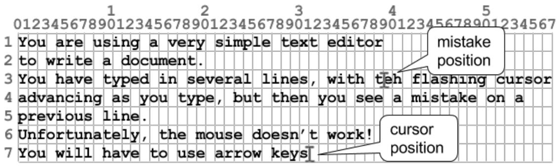 You are using a very simple text editor to create a document. You have typed in several lines, with the flashing cursor advancing as you type, but then you see a mistake on a previous line. Unfortunately, the mouse doesn’t work! You will have to press arrow keys to move the cursor back to the position where you can fix the mistake. Of course, you want to get to this position as quickly as possible.