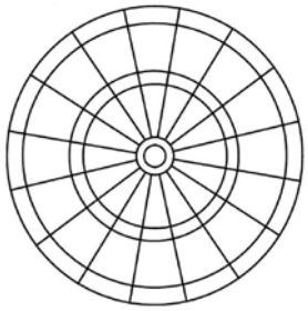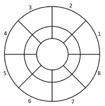 The simpler version of the game is illustrated in Figure 2. More specifically, the board consists of exactly 3 (instead of 6) concentric rings and it may have fewer (instead of exactly 20) wedges. Also, in the simpler board, the wedges are of equal size. The scoring for this simple version is as follows: