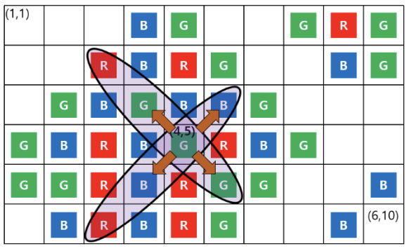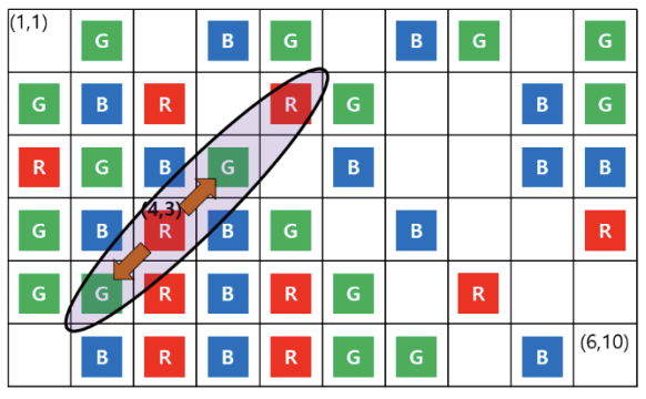 For example, when the current board situation during the game is as in Figure A.1, let the chosen card be a red card placed at $(4,3)$. As shown in Figure A.1, 'connected cards' placed on the diagonal line with a slope of $1$ refer to the cards placed in the oval circle, which should be removed. That is, cards placed in the cells on the movement path while moving diagonally in both directions from the position $(4,3)$ are 'connected cards'. However, while moving in both directions along the diagonal at the chosen cell $(4,3)$, if it encounters a grid boundary or a blank cell, the movement stops.