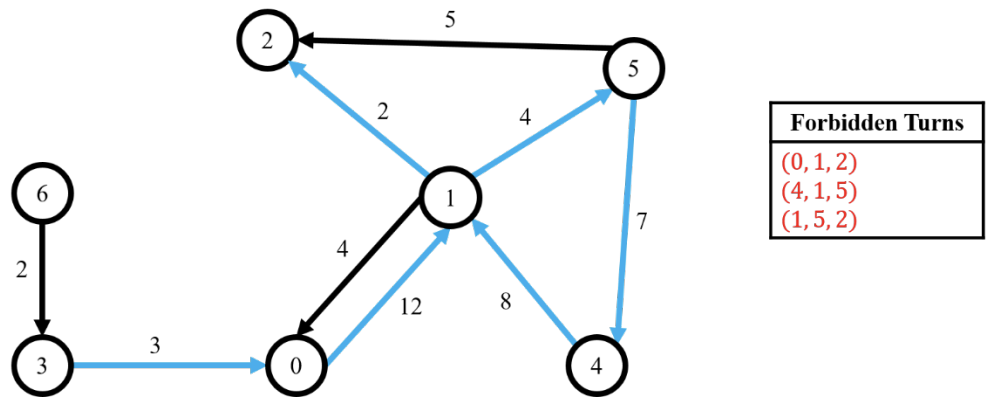 Let's see the following example in the figure below. Each edge cost lies beside each edge and the list of three forbidden turns are in the right box. The shortest path without forbidden turns from the vertex $3$ to the vertex $2$ is $(3, 0, 1, 5, 4, 1, 2)$ which is denoted as blue arrows in the following figure. The distance of the shortest path is $3 + 12 + 4 + 7 + 8 + 2 = 36$. Note that we cannot take the shorter paths $(3, 0, 1, 2)$ and $(3, 0, 1, 5, 2)$ since they contain forbidden turns $(0, 1, 2)$ and $(1, 5, 2)$, respectively.