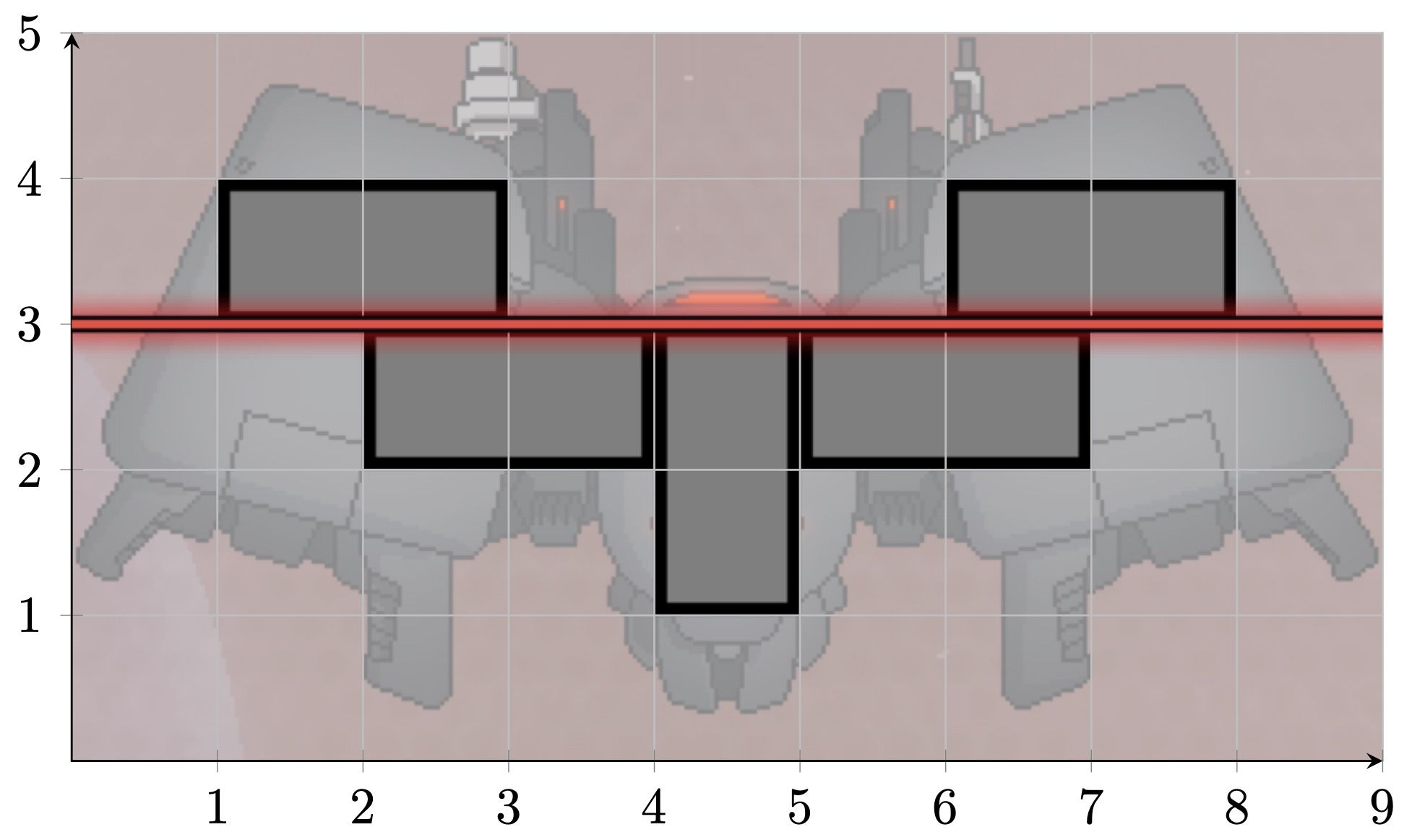 Faster Than Light (FTL) is a space-based top-down strategy game by Subset Games. You control a ship which belongs to the Galactic Federation and have to fight a ship of the Rebel Faction. The enemies' spaceship is represented by a set of axis-aligned non-intersecting rectangles in the plane which correspond to the rooms of the ship. Your ship is close to destruction, but your weapon, the hull beam, is ready to fire.