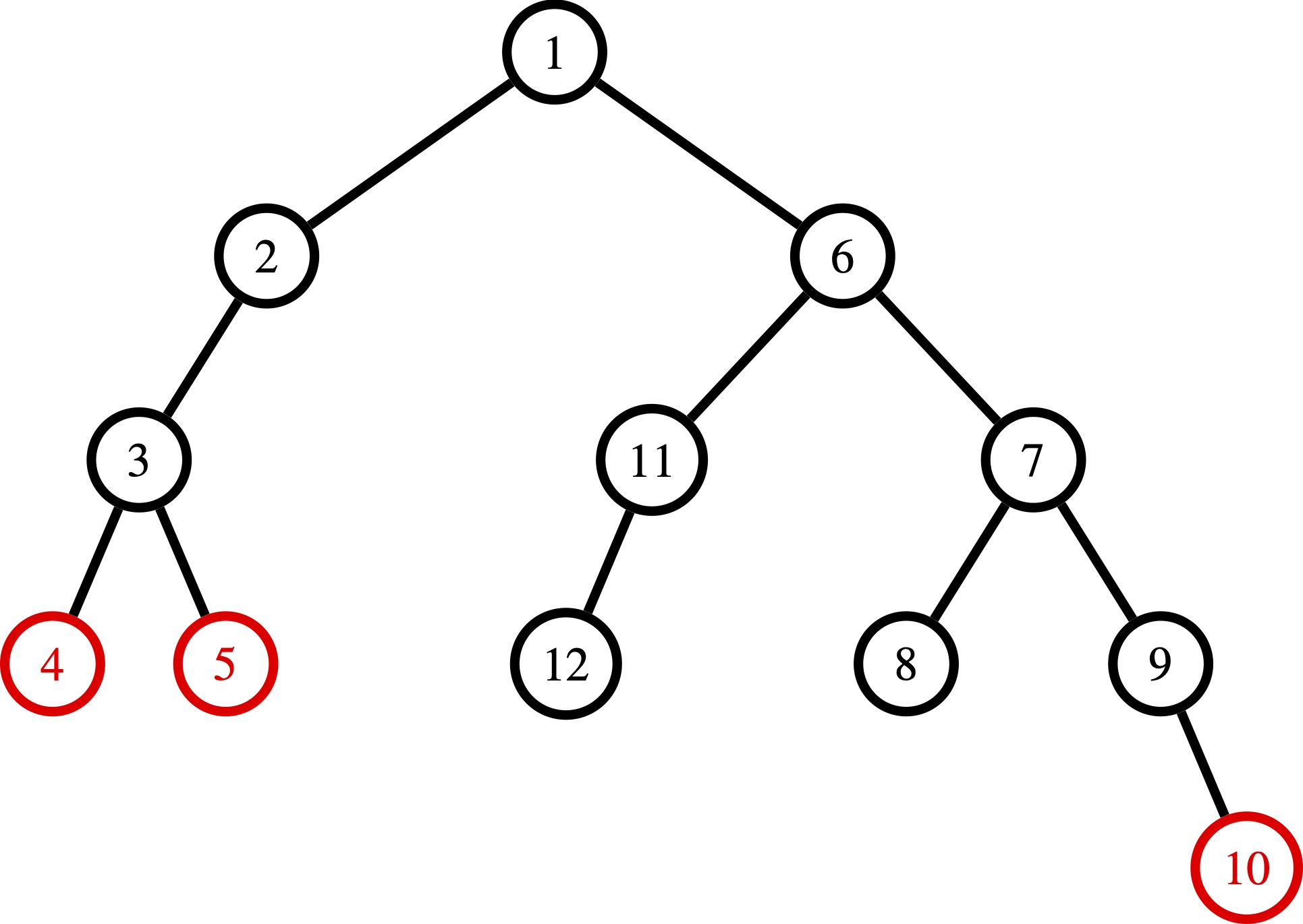 Figure H.1: Illustration of Sample Input 2. The tree becomes strongly balanced after removing the three vertices marked in red ($4$, $5$, and $10$); the minimum number of vertices that need to be removed to make the tree strongly balanced.
