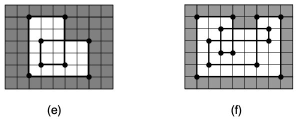 To illustrate, figures (e) and (f) below show the discarded piece (which contains the edges of the wood sheet) of the cut sequences of figures (a) and (b), respectively.