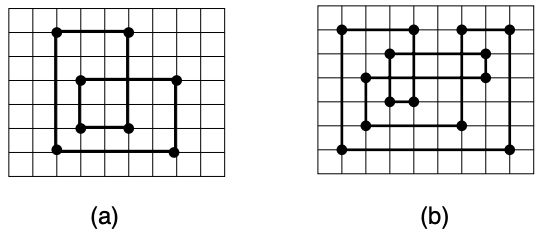 One of the tests consists of programming the machine to perform a non-empty sequence of consecutive cuts that starts and ends at the same point. Each cut in the sequence, except the first, starts at the point at which the previous cut ended. No cuts touch the edge of the sheet to be cut. Figures (a) and (b) below show two examples of cutting sequences, with respectively $8$ and $14$ cuts.