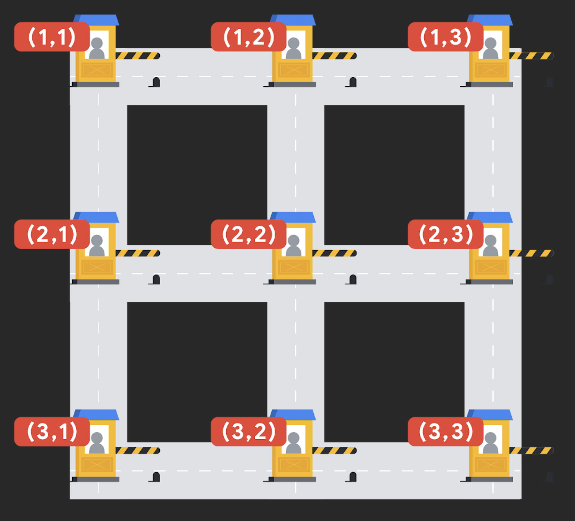 Ada delivers pizzas in a city consisting of a grid of $\mathbf{N}$ horizontal and $\mathbf{N}$ vertical streets, heading from North to South and from West to East, respectively, and numbered from $1$ to $\mathbf{N}$. The top left street crossing of the grid is $(1,1)$.