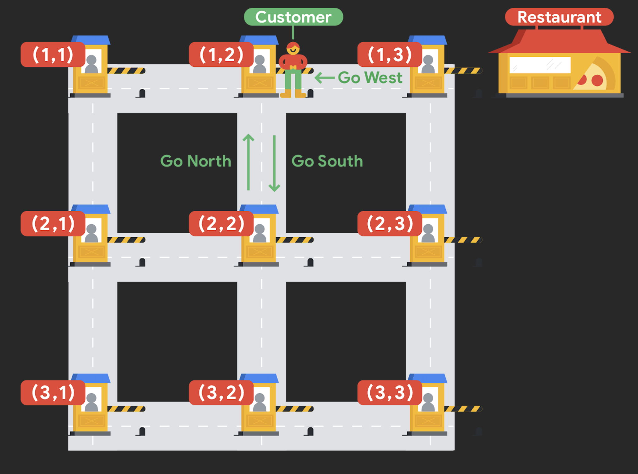 Ada starts at her pizza restaurant at $(\mathbf{A_r}, \mathbf{A_c})$ with $0$ coins and carrying $\mathbf{P}$ pizzas. Her goal is to deliver all of the pizzas within $\mathbf{M}$ minutes. She is free to take any path she likes around the city and finish deliveries anywhere, as long as she manages to drop off all $\mathbf{P}$ pizzas to their respective customers within $\mathbf{M}$ minutes. It takes one minute to walk between two adjacent street crossings, and takes no additional time to drop off a pizza at a customer's location. There are some additional rules and constraints to note: