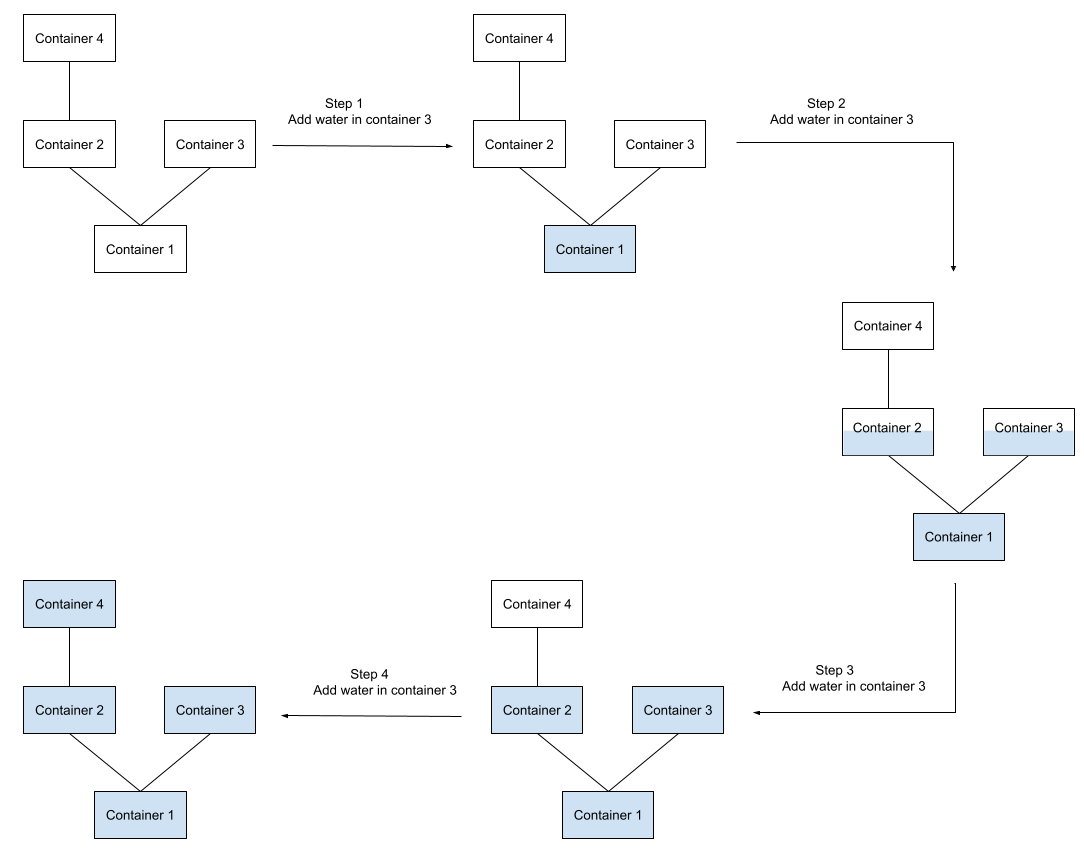 In step $4$, after adding $1$ liter of water in container $3$, the water is pushed up to water container $4$, which is then completely filled.