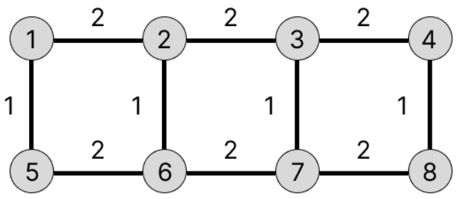 The train network corresponding to the first example is illustrated in Figure C.1. Let's denote a route on which you visit station numbered $a_i$ in the figure as the $i$-th station by $[a_1, a_2, \dots , a_k]$. For example, the minimum cost $18$ is achieved by a route $[2, 1, 5, 6, 2, 3, 7, 8, 4, 3, 7, 6, 2]$.