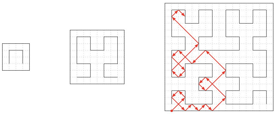 Ostatnim krzykiem mody wśród mieszkańców Bajtocji stała się dość oryginalna gra o nazwie bilard Hilberta. Stół do tej gry ma wymiary 2n+1×2n+1, a liczbę n nazywamy rozmiarem stołu. Na stole umieszczono przegrody tworzące krzywą Hilberta rzędu n. Poniższy rysunek przedstawia stoły dla n = 1, 2, 3.