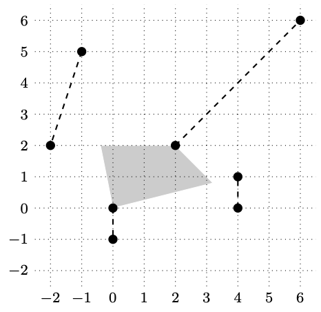 Wyjaśnienie przykładu: Poniższy obrazek przedstawia położenie wież magów (czarne punkty) oraz obszar bezpieczny (szara figura). Punkt (1, 3/2 ) jest bezpieczny: dla każdego kierunku istnieje mag, że poruszenie się z punktu (1, 3/2) w tym kierunku powoduje zbliżenie się do obu wież tego maga. Punkt (5, 5) nie jest bezpieczny: poruszenie się z niego w górę spowoduje oddalenie się od wszystkich wież oprócz drugiej wieży czwartego maga.