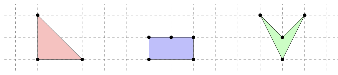 Poniżej widać przykłady niepoprawnych wielokątów. Pierwszy i drugi wielokąt mają punkt kratowy na którymś z boków. Drugi i trzeci nie są wypukłe. Dodatkowo, pierwszy i trzeci mają boki, których długości nie są całkowite.