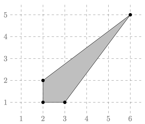 Wyjaśnienie do przykładu: Mamy X = 6, Y = 5, K = 5. Jednym z 42 poprawnych wielokątów jest wielokąt (2, 1),(2, 2),(6, 5),(3, 1), widoczny na obrazku.