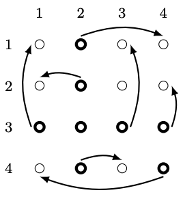 Wyjaśnienie pierwszego przykładu: Na poniższym rysunku przedstawiono sytuację po pierwszej poprawce króla. Cyrkowcy rozpoczynający finał z hula-hop są zaznaczeni pogrubionymi kółkami. Strzałki pokazują możliwy przebieg rzutów: