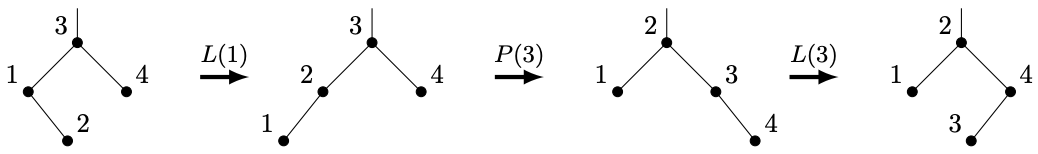 Wyjaśnienie pierwszego przykładu: Na poniższym rysunku przedstawiono minimalną liczbę rotacji przekształcającą drzewa: