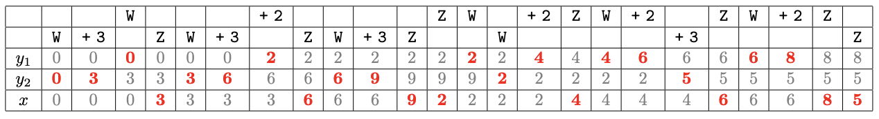 W – wczytanie wartości globalnej zmiennej x do prywatnego licznika y,Z – zapisanie wartości prywatnego licznika y na globalną zamienną x,+ c – zwiększenie prywatnego licznika y o dodatnią stałą c,- c – zmniejszenie prywatnego licznika y o dodatnią stałą c.Bajtek uruchomił wszystkie programy równolegle. Początkowe wartości wszystkich liczników y oraz zmiennej x wynosiły 0. Programy zostały wykonane w pewnym przeplocie, czyli wszystkie operacje ze wszystkich programów zostały wykonane jedna po drugiej, w pewnej kolejności spełniającej warunek, że w każdym momencie był wykonany prefiks każdego programu.