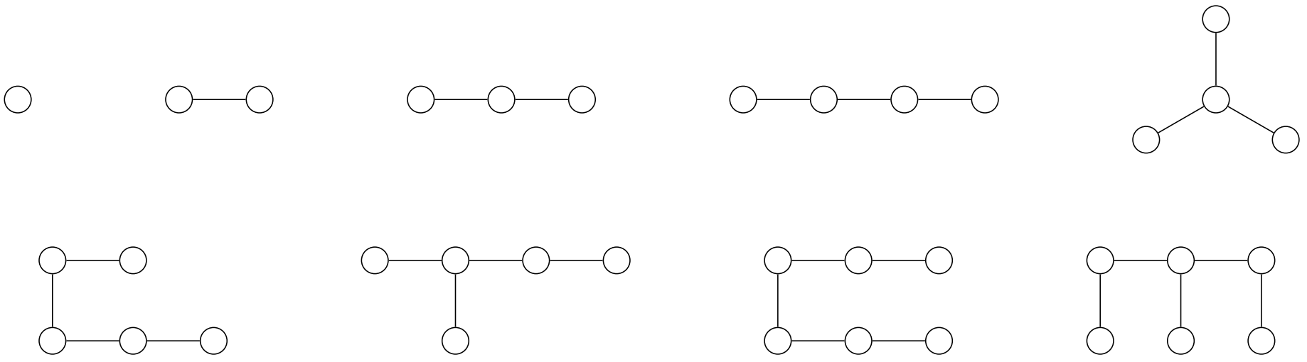 Wyjaśnienie pierwszego przykładu: wszystkie różne 1-pokolorowane drzewa o maksymalnym zbiorze niezależnym rozmiaru 1, 2 lub 3 są przedstawione poniżej: