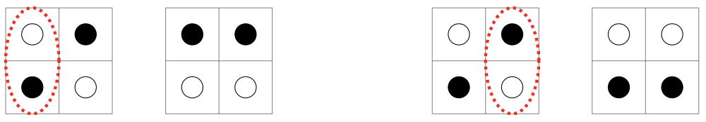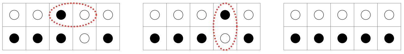 Wyjaśnienie do przykładu: Poniższe rysunki przedstawiają dwa ruchy potrzebne, aby wszystkie białe kulki znalazły się w jednym rzędzie oraz wszystkie czarne kulki w jednym rzędzie.