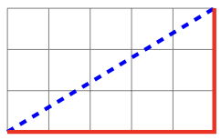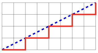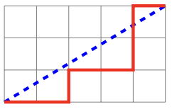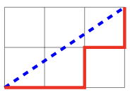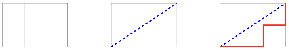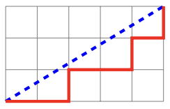 Bajtosia ma swój ulubiony ułamek zwykły p/q , gdzie p oraz q są liczbami całkowitymi dodatnimi. Ułamek Bajtosi niekoniecznie jest ułamkiem w postaci skróconej, może to być ułamek 1 2 , 4 8 , lub 6 4 . Na kartce w kratkę narysowała (wzdłuż linii kratek) prostokąt o wysokości p i szerokości q. W tym prostokącie narysowała przekątną od lewego dolnego rogu do prawego górnego rogu. Następnie, również od lewego dolnego rogu do prawego górnego rogu, poprowadziła zygzak pod narysowaną przekątną, przesuwając ołówek w prawo lub do góry wzdłuż linii kratek. Zygzak musi przez cały czas biec jak najwyżej to możliwe, jednak nigdy nie powinien przekraczać przekątnej (choć może jej dotykać). Innymi słowy: Bajtosia zawsze rysuje kreskę w górę, o ile nie przekracza w ten sposób przekątnej. Jeżeli kreska przekroczyłaby przekątną, wtedy rysuje kreskę w prawo.