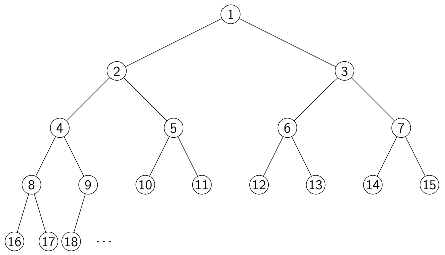 Przypomnijmy jak wygląda drzewo binarne. Węzły tego drzewa będziemy numerowali kolejnymi liczbami naturalnymi od 1, idąc kolejnymi poziomami od góry do dołu poczynając od korzenia (wierzchołka na samej górze), a na każdym poziomie od lewej do prawej: