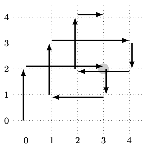 Wyjaśnienie przykładu: Robocik znajdzie się w punkcie (3, 2) po 6 i 22 sekundach od włączenia. Poniższy rysunek przedstawia trasę robocika: