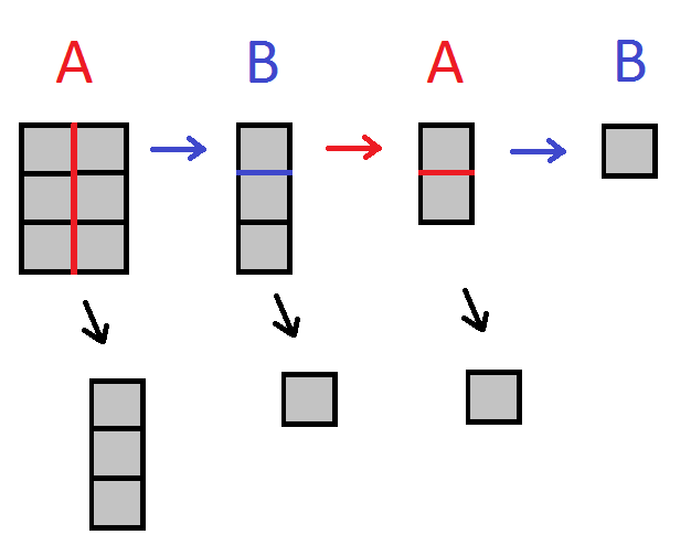 I det första exemplet så vinner $A$ genom att dela brädet i två delar av storlek $1 \times 3$. Oavsett hur $B$ sedan gör så får $A$ nästa gång välja mellan delar av storlek $1 \times 2$ och $1 \times 1$. Rätt strategi är att välja $1 \times 2$ (det andra leder direkt till en förlust). $B$ tvingas sedan att välja mellan två delar av storlek $1 \times 1$, som båda innebär förlust.