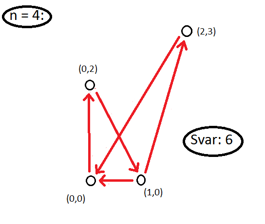 Sektionslokalerna finns på punkter i planet med heltalskoordinater. Elise och hennes kompisar går alltid kortaste avståndet mellan två lokaler. Avståndet är det vanliga Euklidiska, dvs. $\sqrt{(x_1 - x_2)^2 + (y_1 - y_2)^2}$. De får börja vid vilken lokal som helst. Det är tillåtet att besöka samma sektionslokal flera gånger, och det räknas som separata besök. Däremot får de inte besöka samma ställe två gånger på raken.