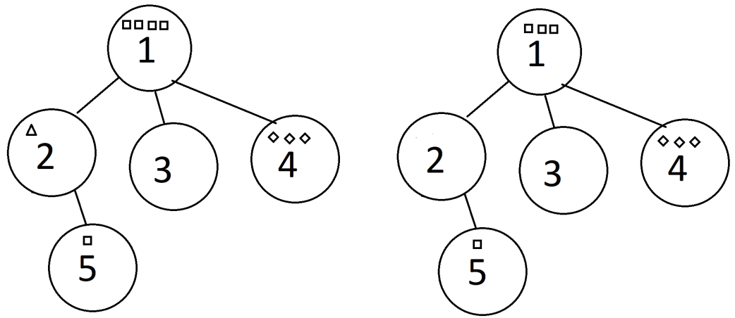 After that, a dragonfly flies to pond 5. It eats a bug from pond 1 and a bug from pond 5. Note that it does not eat any bugs from pond 2 because there are no more bugs left in pond 2. Although 2 bugs are eaten in total, they are of the same species □, so only 1 distinct species of bugs is eaten.