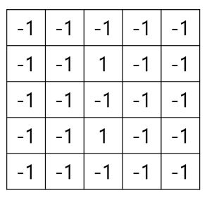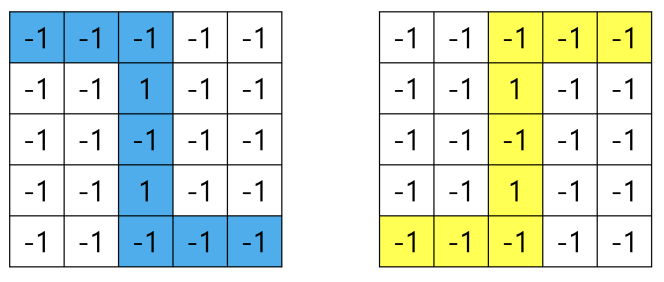 $N = 5$, $V = [[−1, −1, −1, −1, −1], [−1, −1, 1, −1, −1], [−1, −1, −1, −1, −1], [−1, −1, 1, −1, −1], [−1, −1, −1, −1, −1]]$인 경우를 생각해 보자.