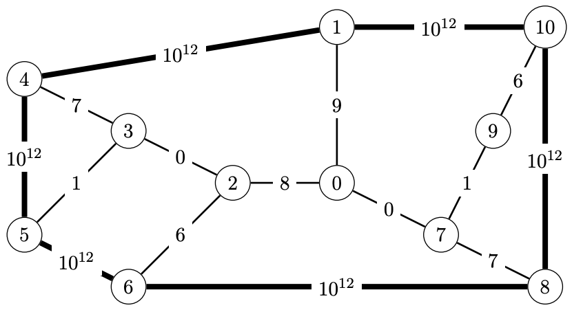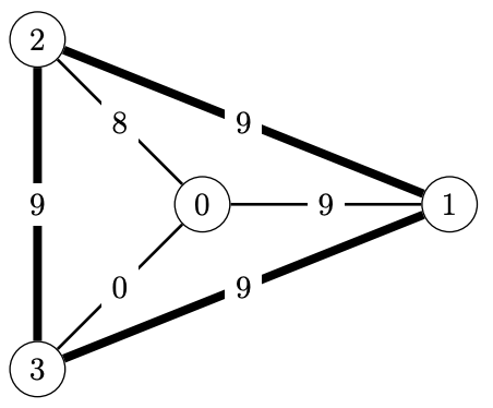 KOI 도시의 홀수 사이클은 총 $4$개로, $\{0, 1, 2\}, \{0, 2, 3\}, \{0, 3, 1\}, \{1, 2, 3\}$이 있다. 시장이 $(0, 3)$을 잇는 가중치 $0$의 도로와, $(1, 2)$를 잇는 가중치 $9$의 도로에 경찰을 배치할 경우, 모든 홀수 사이클에 경찰이 배치된 도로가 하나 이상 존재한다. 이 배치의 비용은 $0 + 9 = 9$이며, 이보다 더 적은 비용으로 목표를 달성할 수 없다.
