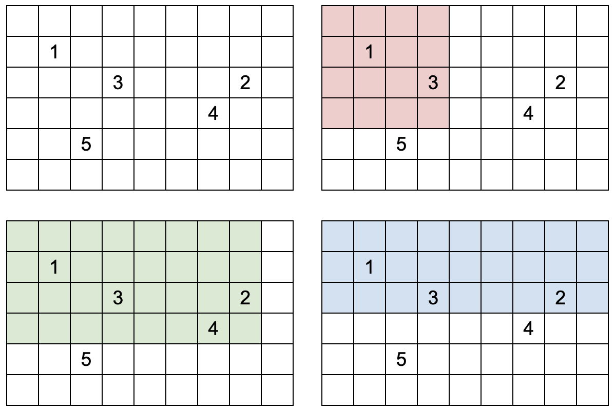 Bob은 2차원 격자무늬 평면에 색종이와 블록을 올려놓고 재미있는 놀이를 하고 있다. 각 블록의 크기는 1x1로 모두 동일하며, 같은 위치에 블록을 여럿 쌓을 수도 있다. 조금 더 구체적으로, $N$개의 블록이 있을 때 $i$ 번째 블록의 위치는 $(x_i, y_i)$ 라 하자. 이 문제의 예제에서 좌측 상단이 (1, 1) 이며 좌-우가 $x$축이다. 가령 아래 그림에서 좌측 상단의 경우 1번 블록은 (2, 2) 위치에 있고 3번 블록은 (4, 3) 위치에 있다.