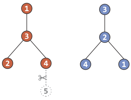 The figure below corresponds to the first sample, with tree $T_1$ on the left and tree $T_2$ on the right. The subtree of $T_1$ formed by all of its vertices but vertex $5$ is isomorphic to $T_2$.
